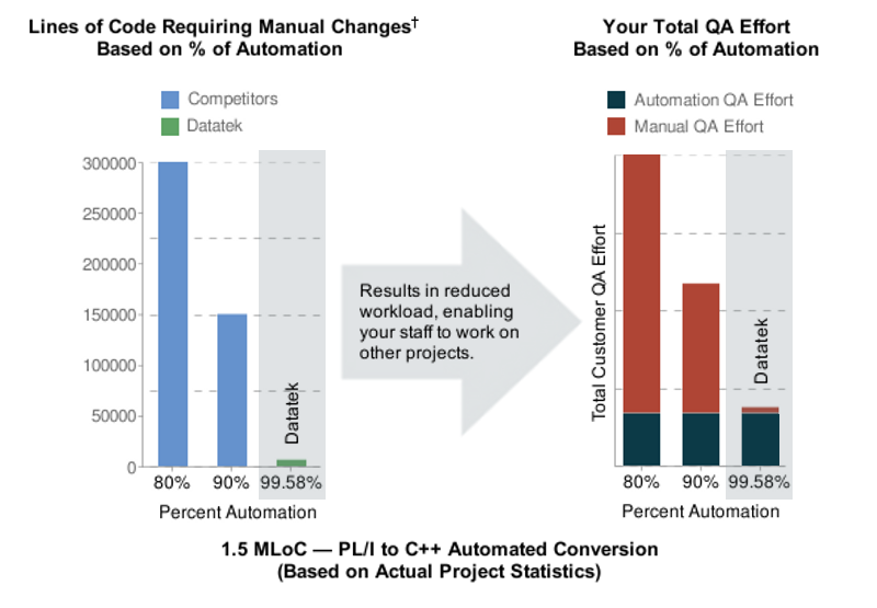 †Datatek converts 100% of your code. For this particular project, 99.58% of the customer’s PL/I was converted by the automated converter and 0.42% manually. You will never receive partially converted code. |